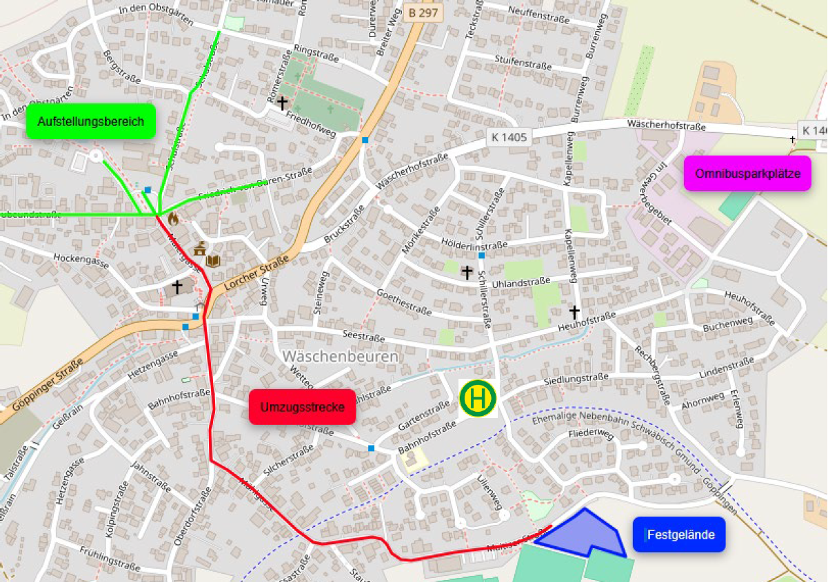 Die Umzugsstrecke der Festumzüge am Samstag und Sonntag verläuft über die Maiergasse, B297, Oberdorfstraße, Mühlgasse auf das Festplatzgelände an der Maitiser Straße.